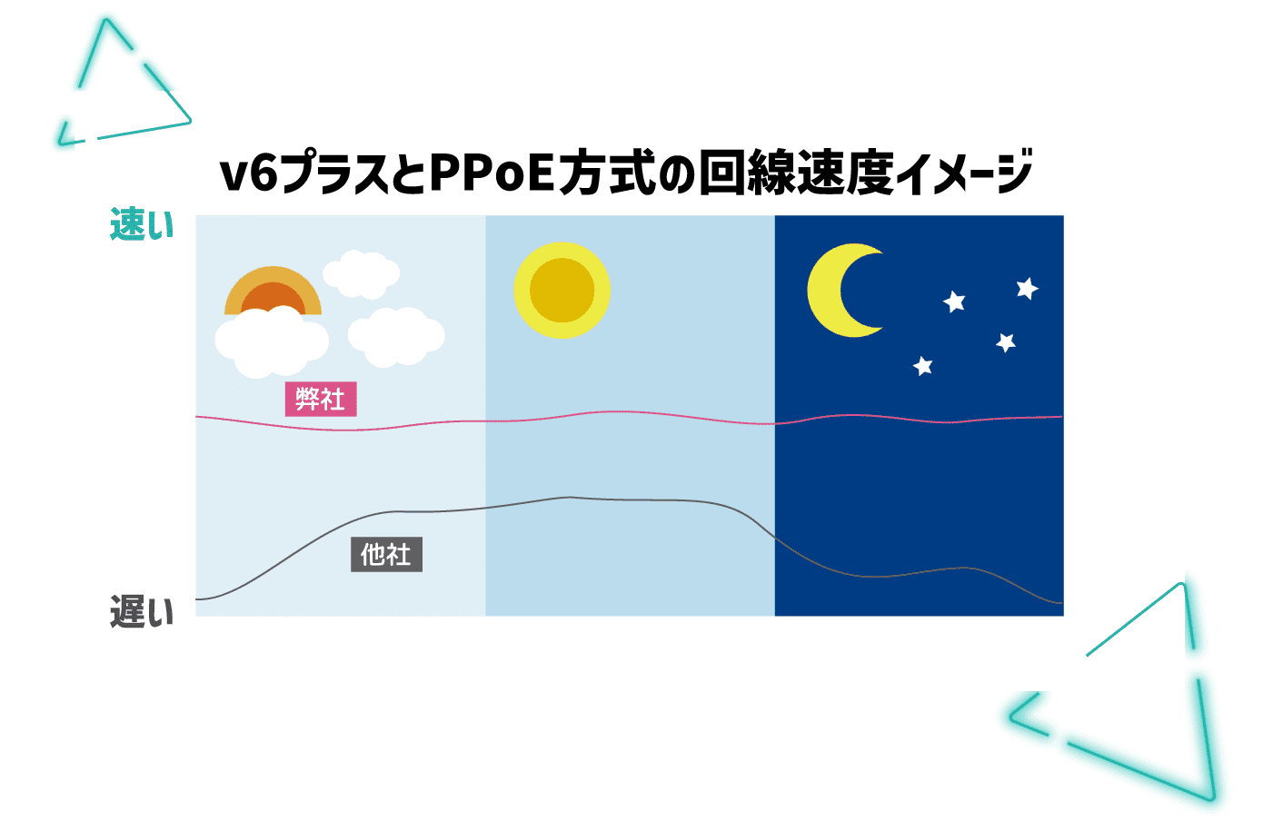 今までのPPPoeにあった、速度を遅くする原因、それもボトルネックを解消し、快適で速いインターネットを提供します。